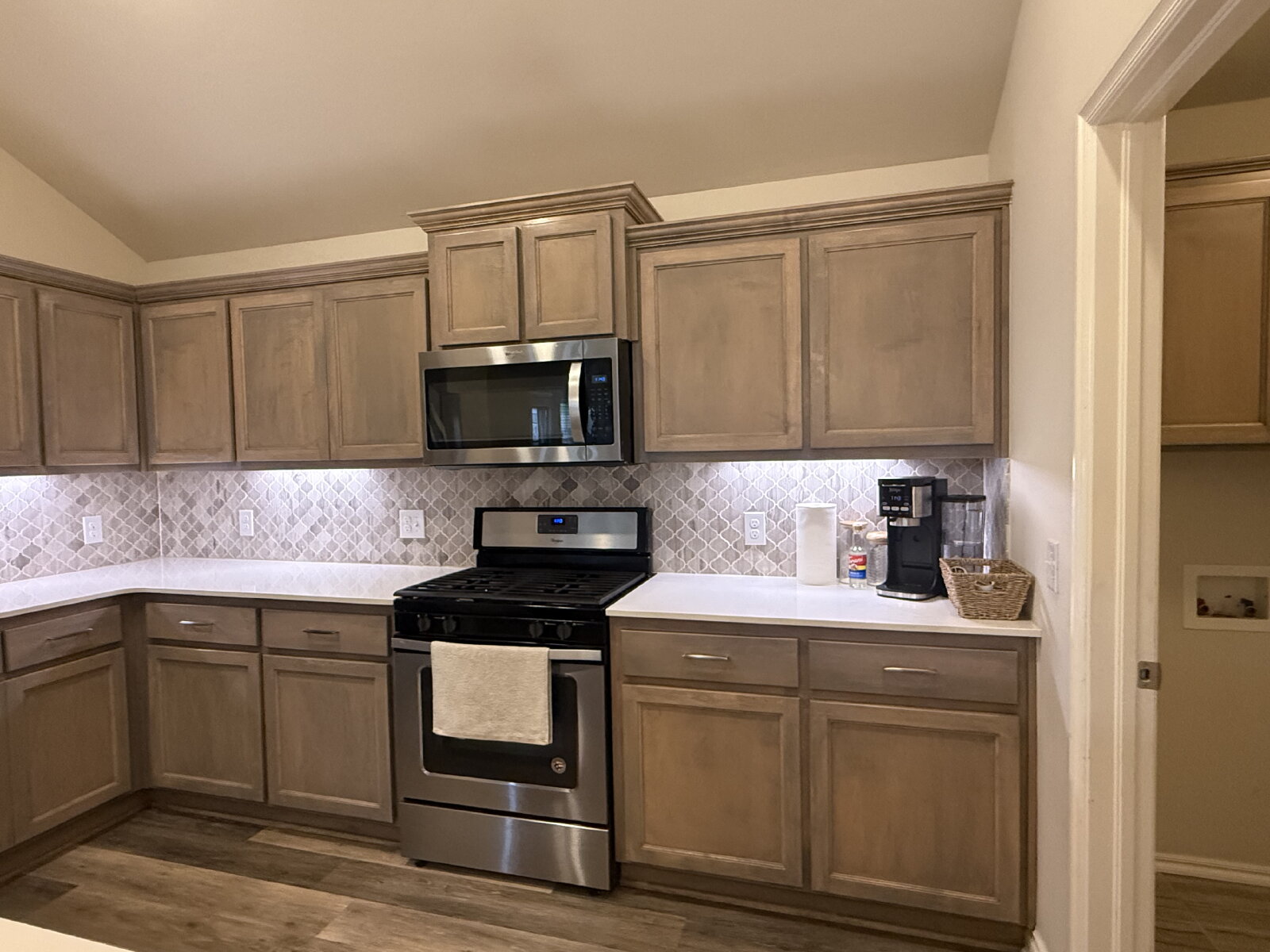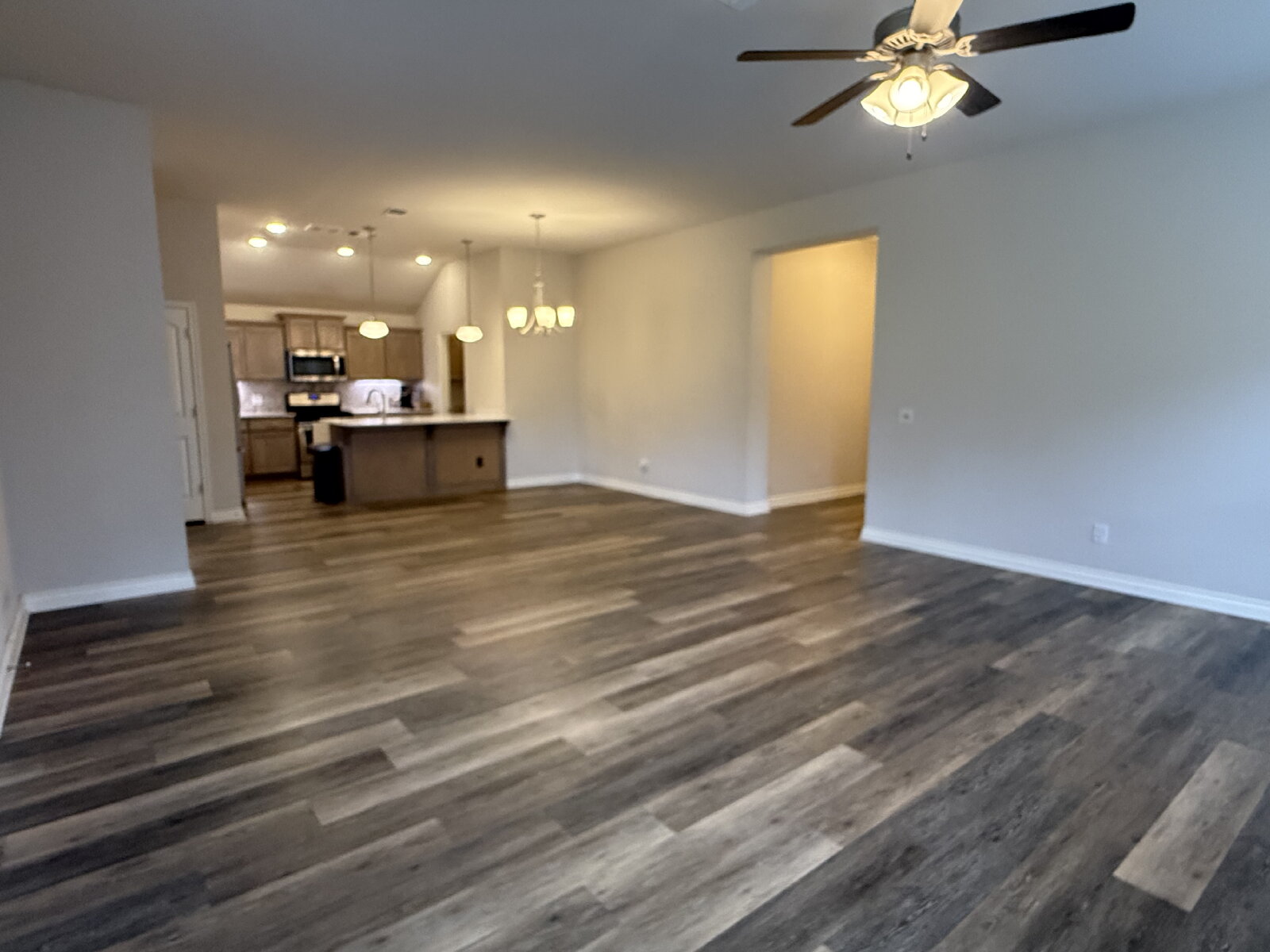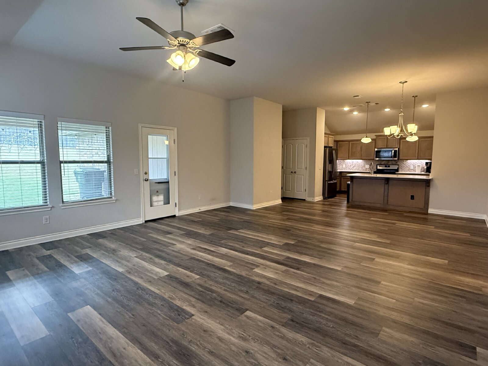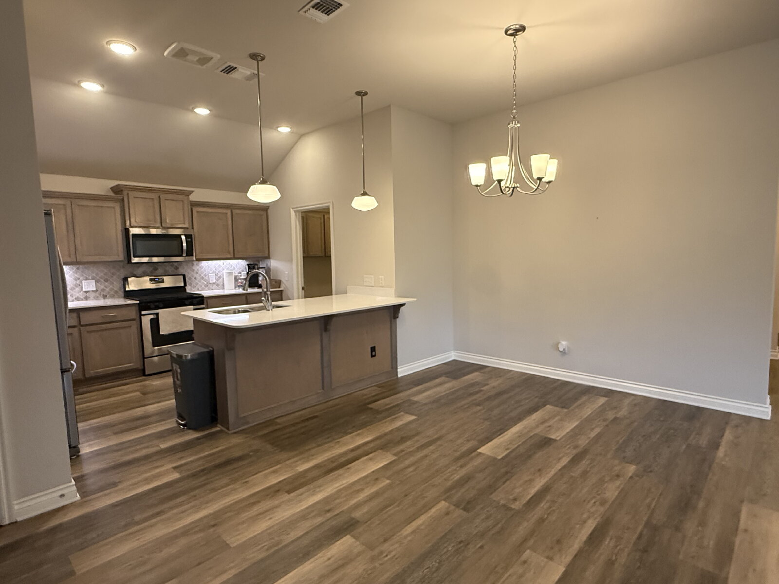 The open-concept living area flows seamlessly into the kitchen and dining space, creating a warm and inviting atmosphere. The kitchen features ample cabinet and counter space, making meal prep easy and efficient.