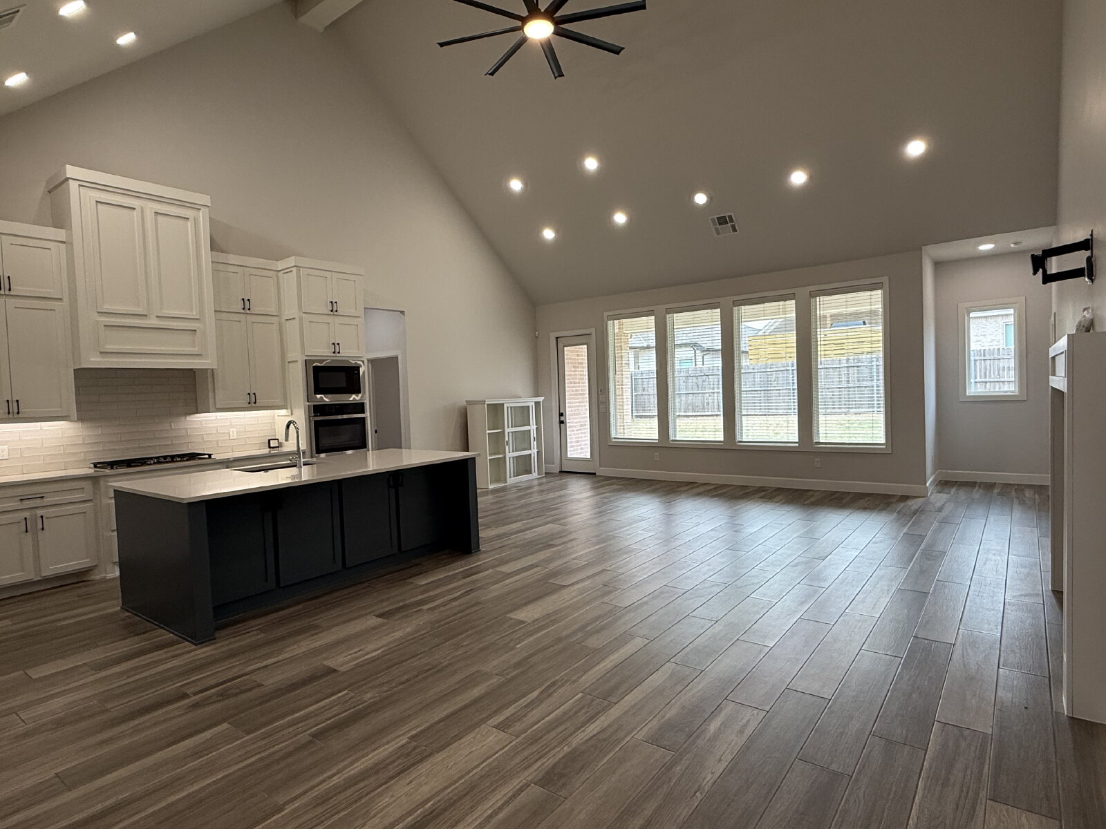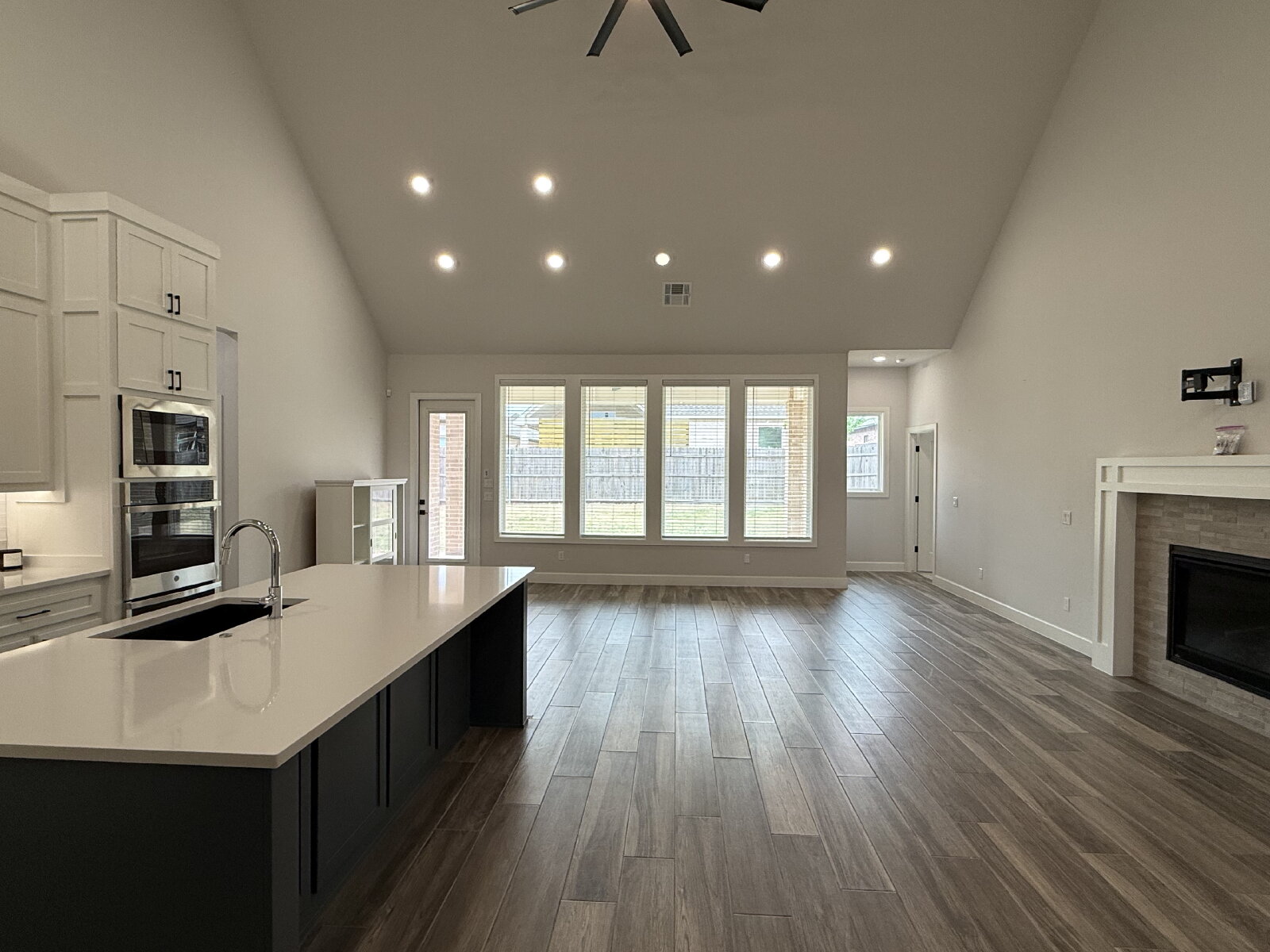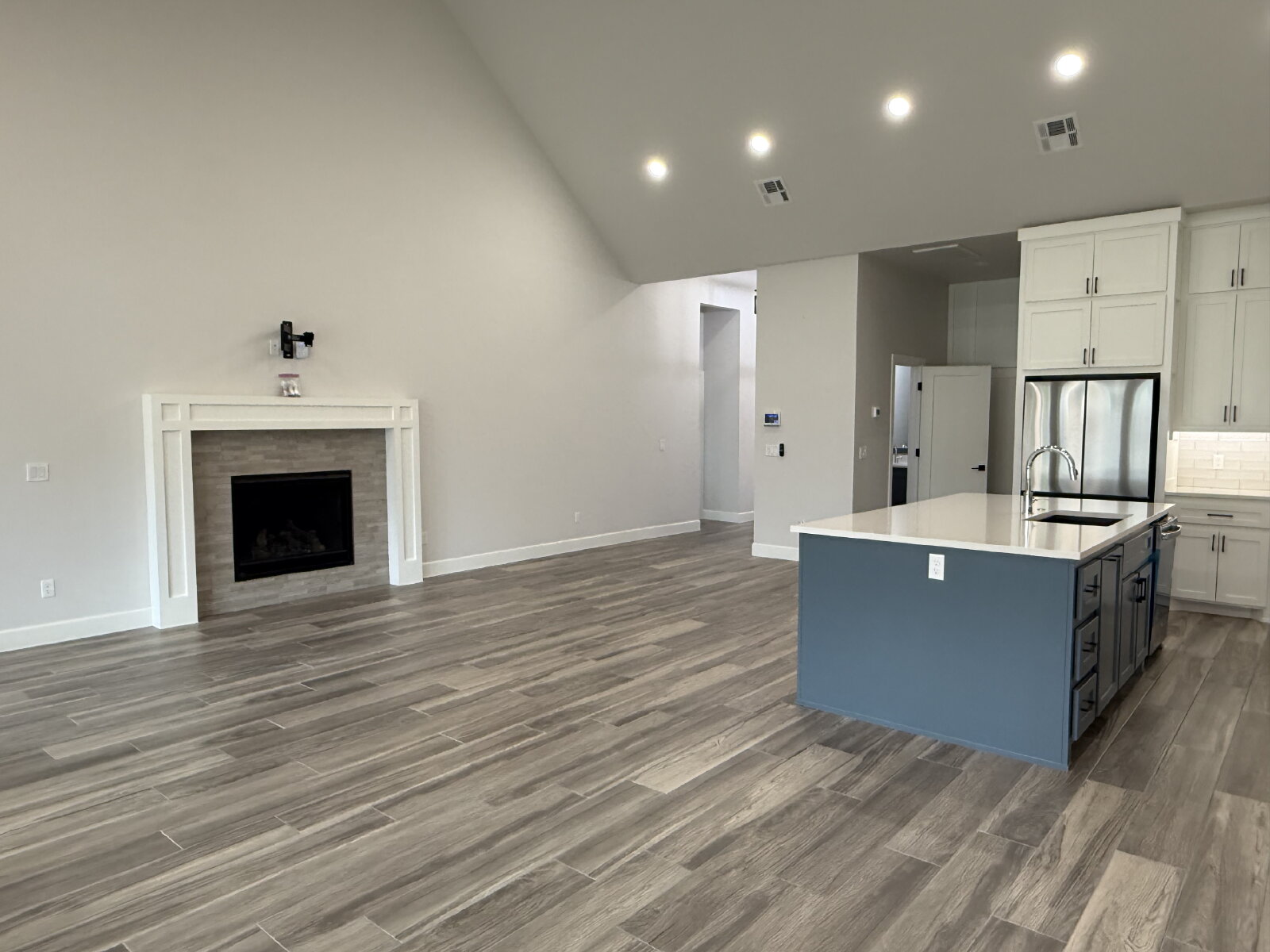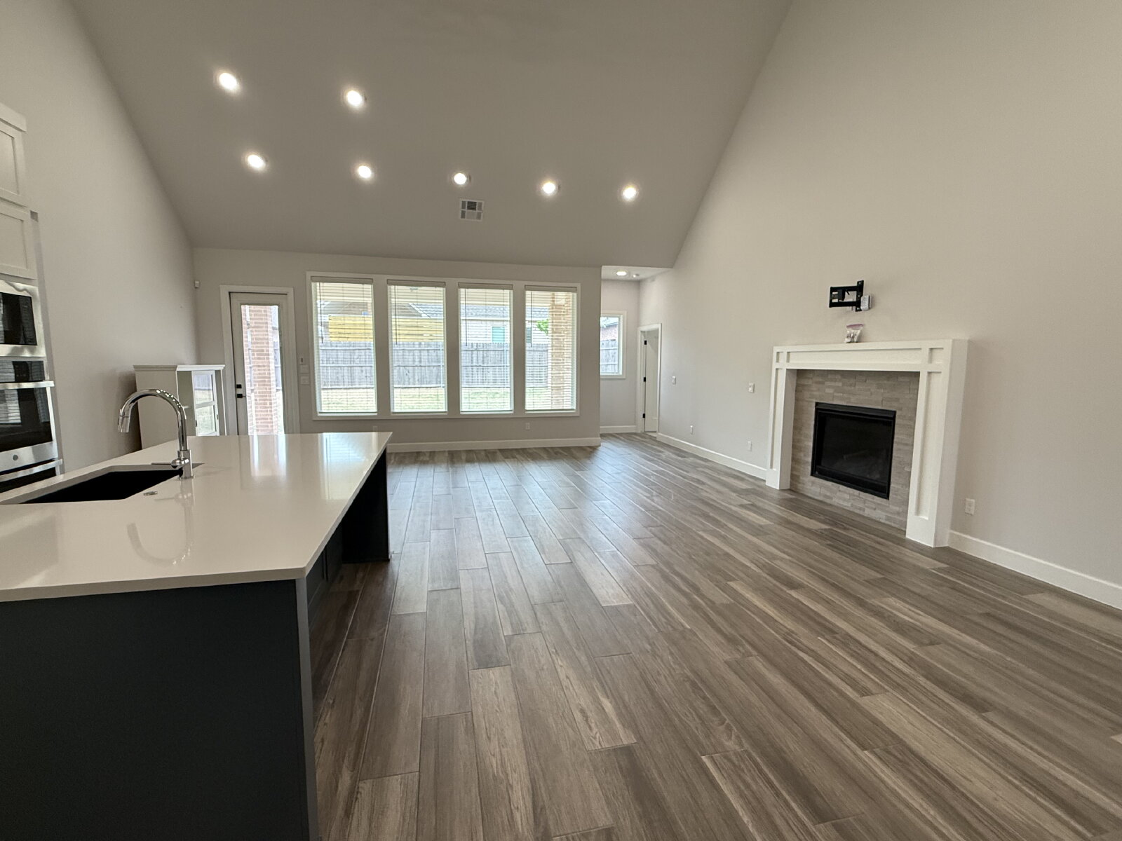 The spacious living room features a stunning fireplace and flows seamlessly into the open-concept kitchen, complete with solid surface countertops, a gas cooktop, and a large walk-in pantry. The adjoining dining area is filled with natural light and highlighted by modern lighting, making it perfect for both daily living and entertaining.