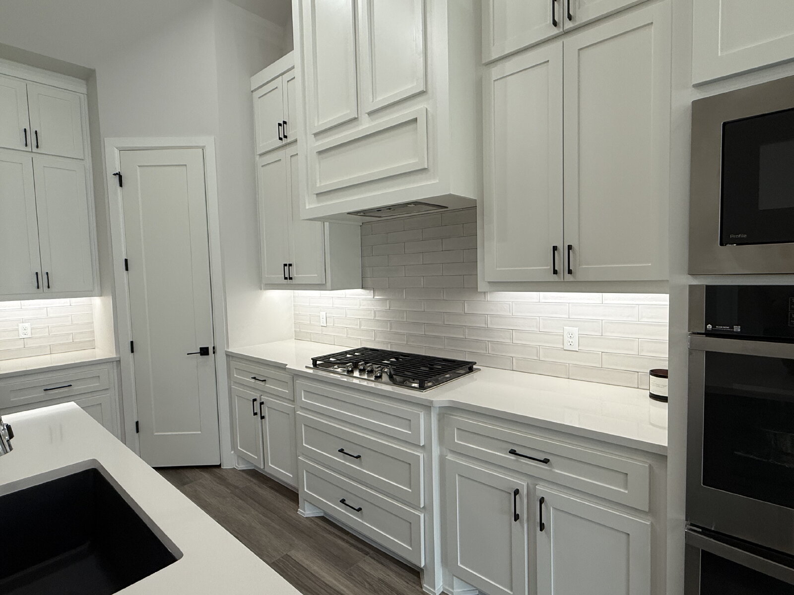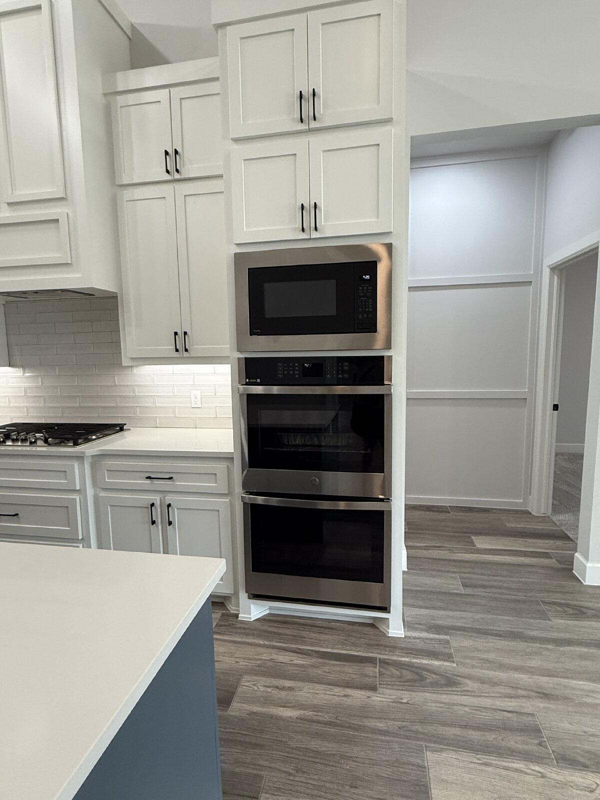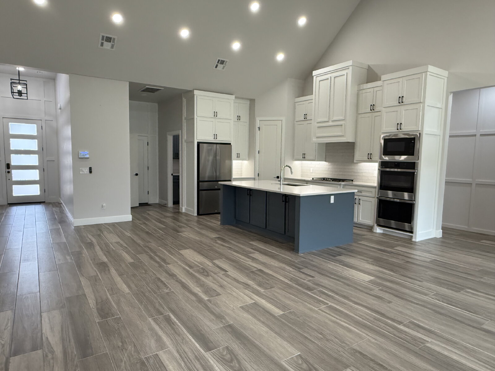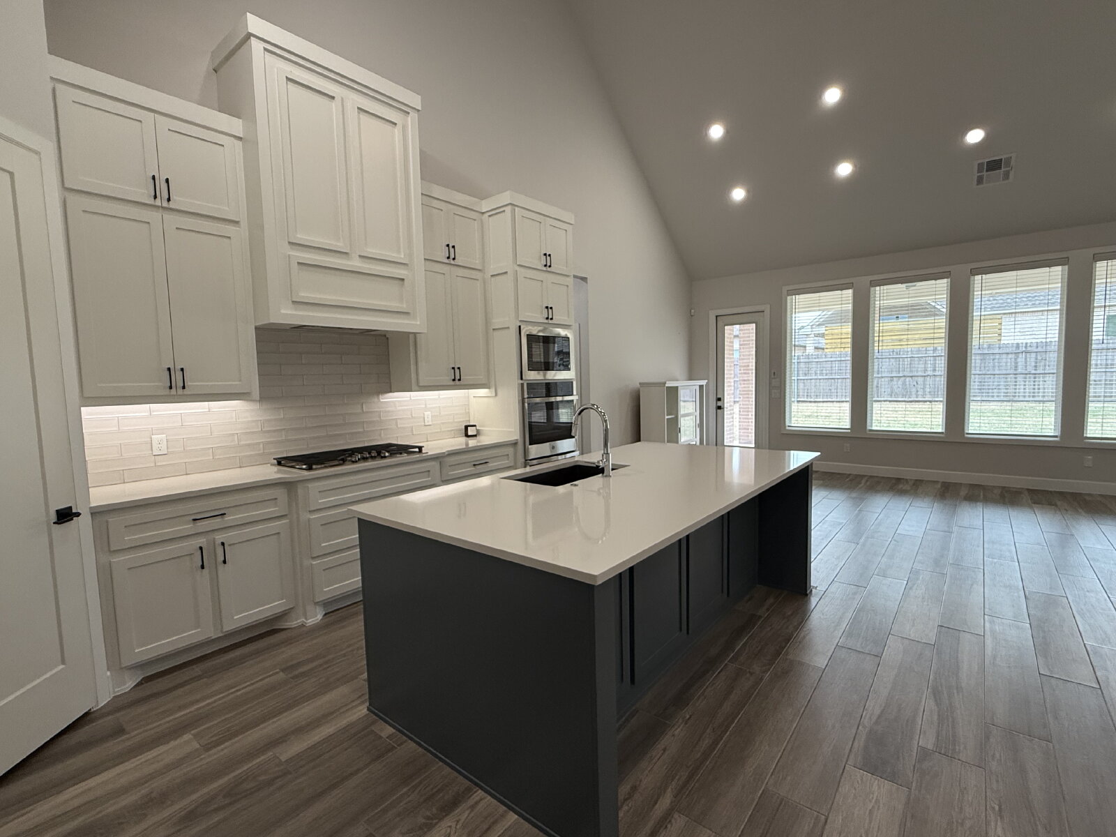 The spacious living room features a stunning fireplace and flows seamlessly into the open-concept kitchen, complete with solid surface countertops, a gas cooktop, and a large walk-in pantry. The adjoining dining area is filled with natural light and highlighted by modern lighting, making it perfect for both daily living and entertaining.